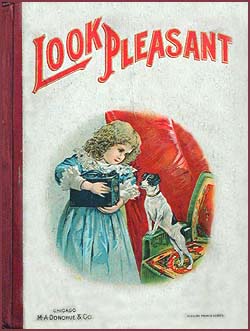 is undated. The cover pcture of the little girl with camera doesn't seem to illustrate any of the rhymes inside. The postcard with the same image is dated 1904 so the book must be about the same age. "Look Pleasant" is the early version of "Smile". |