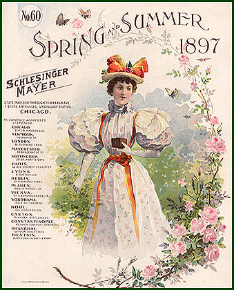 On this 1897 dry-goods catalog cover, the model is decked out in a gorgeous spring outfit, incongruously holding a small brown camera. The catalog is from Schlesinger and Mayer, a department store based in Chicago with branches all over the world including London, Paris, Berlin, Constantinople, Yokohama, and Shanghai. The store index on the back of the cover lists: "Capes, Carpets, Challies, Chemises, Children's bonnets and reefers, Collars, Cuffs, Corsets, Crepes and mourning goods, Cutlery, and Cycling hose" among its stock for sale---but no Cameras! |
