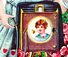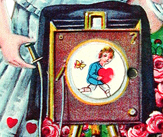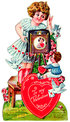 The wheel on the side of this "mechanical" card allows the viewer to rotate the pictures inside the lens of the camera. The three images show a portrait of the little girl photographer, a portrait of her intended recipient, and a child running with a heart, presumably in the process of delivering the Valentine. |