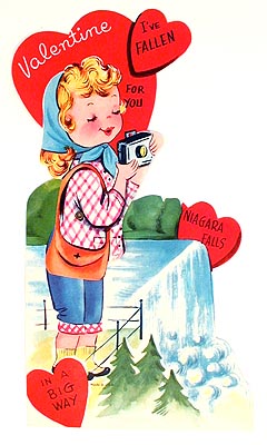 This die cut mechanical camera girl at Niagra Falls is able to fall for her Valentine "in a big way" because she is made in two pieces connected by a tiny metal grommet. |