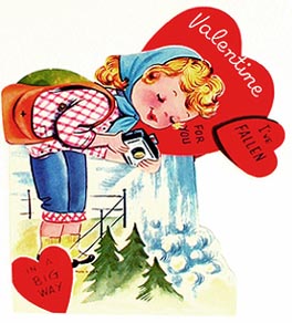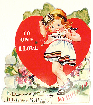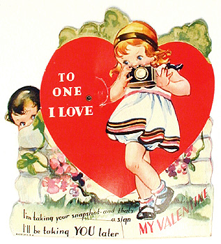 This is another example of a Valentine in two pieces connected by a tiny grommet. When the little girl lowers her camera into position to take a photo, the little boy's head pops up from behind the wall. |