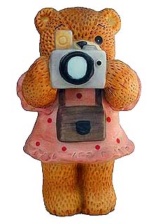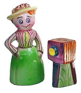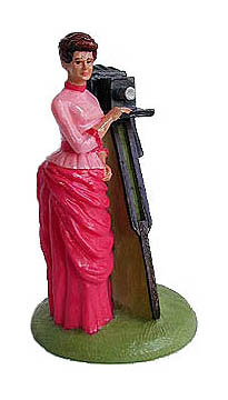 This tiny 2 1/4" porcelain figurine is my favorite figurine. Her delicate face contrasts with her serious camera which is open and ready for action. "Germany" is impressed into her side but no manufacturer's name. If anyone out there is familiar with this maker, please let me know. |