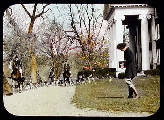 This is a tinted black and white photo lantern slide of a fall hunting scene on an unidentified estate. Is this Virginia? Please let me know if you recognize the imposing entryway of the mansion.